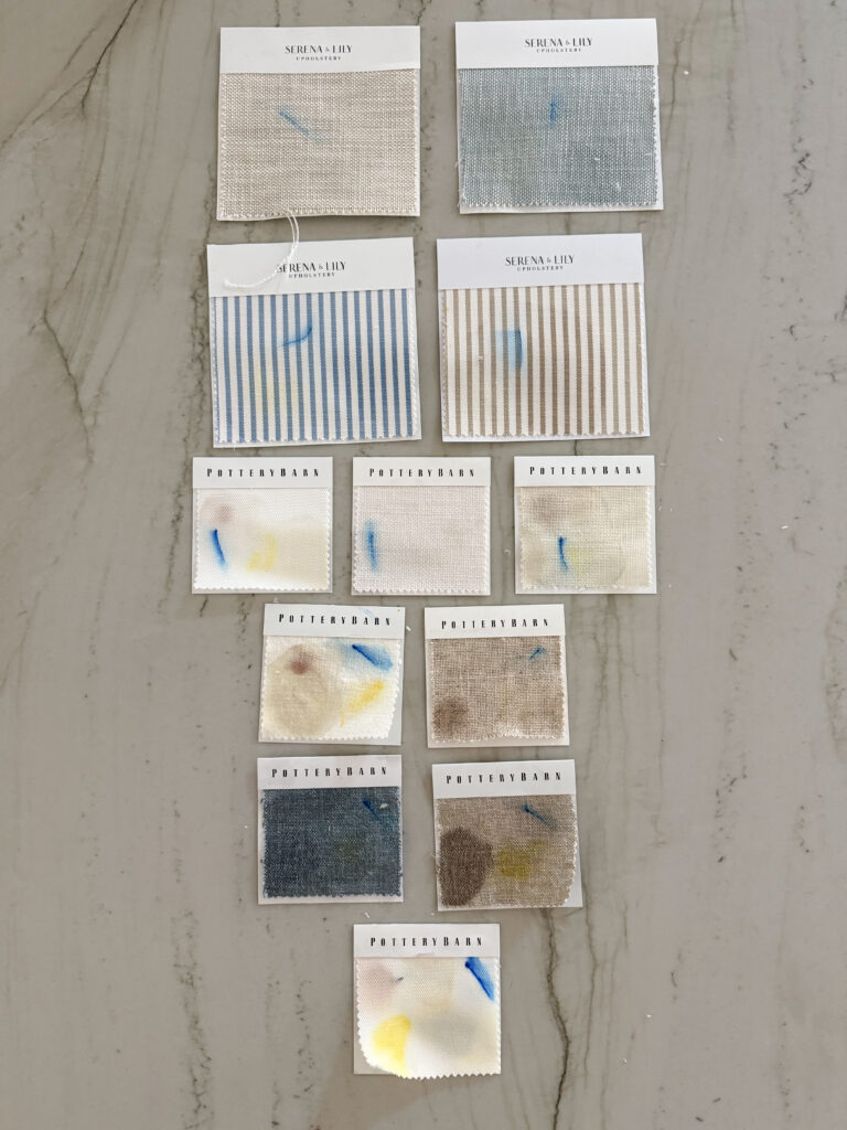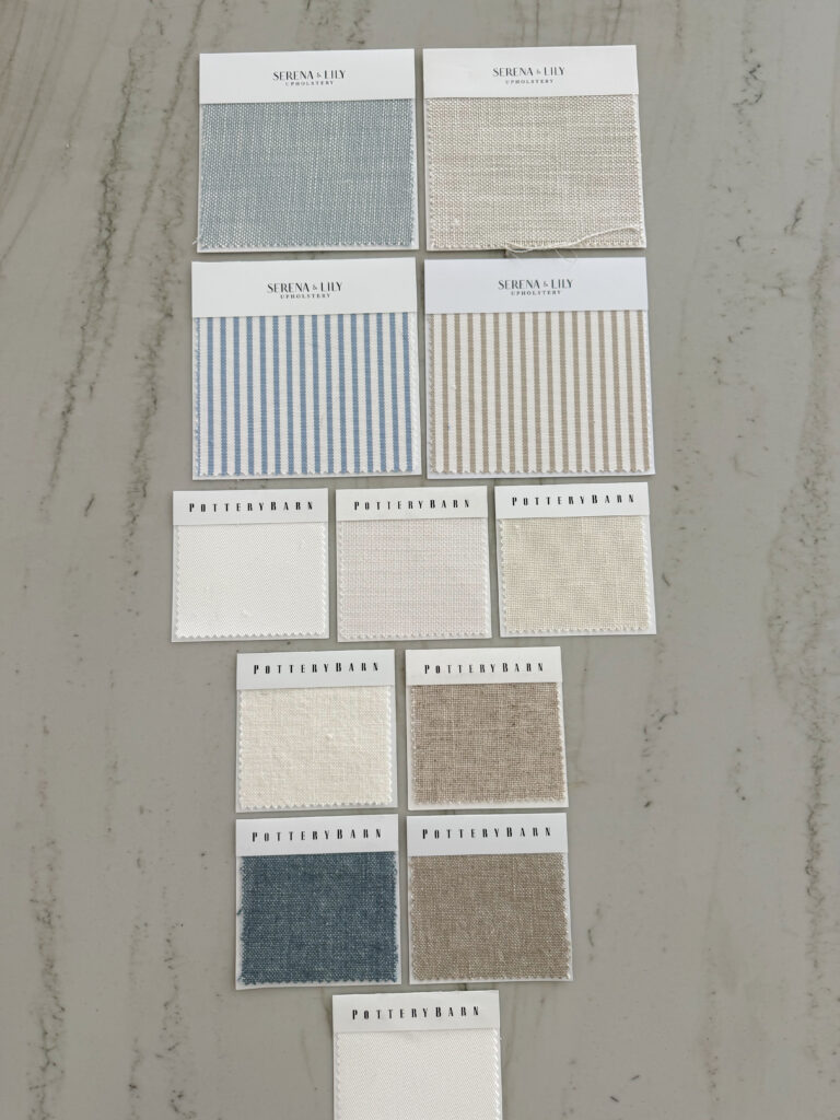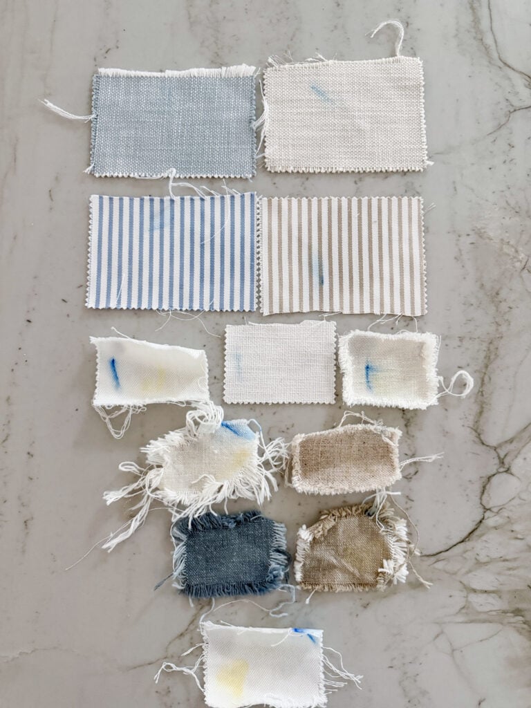 SOURCES (top to bottom, left to right): Perennials Basketweave in Sky (a lighter blue but same fabric of our outdoor swivel chairs) | Perennials Basketweave in Chalk (what we have on our carriage house sofa above)| Perennials Pinstripe in Coastal Blue | Perennials Pinstripe in Sand | Performance Twill in Warm White | Sunbrella Performance Slub Tweed in White | Performance Everydaylinen in Ivory | Performance Rustic Linen in White | Performance Everydaylinen in Oatmeal (the fabric currently on our living room sofas) | Performance Rustic Linen in Chambray | Performance Rustic Linen in Parchment | Twill in White (the only non-performance fabric tested)
