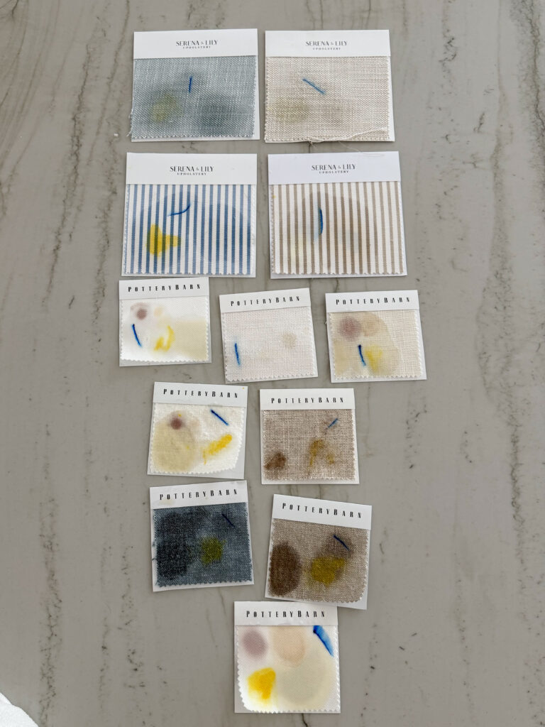 I’ve been collecting fabric samples since the day we knew we were building our new home. As I narrowed down my furniture selections (particularly once we knew we’d be selling our home fully furnished), I did some aggressive sample testing. And by that, I mean I tried to destroy every single fabric I was considering! You can watch a quick video of everything in action here.