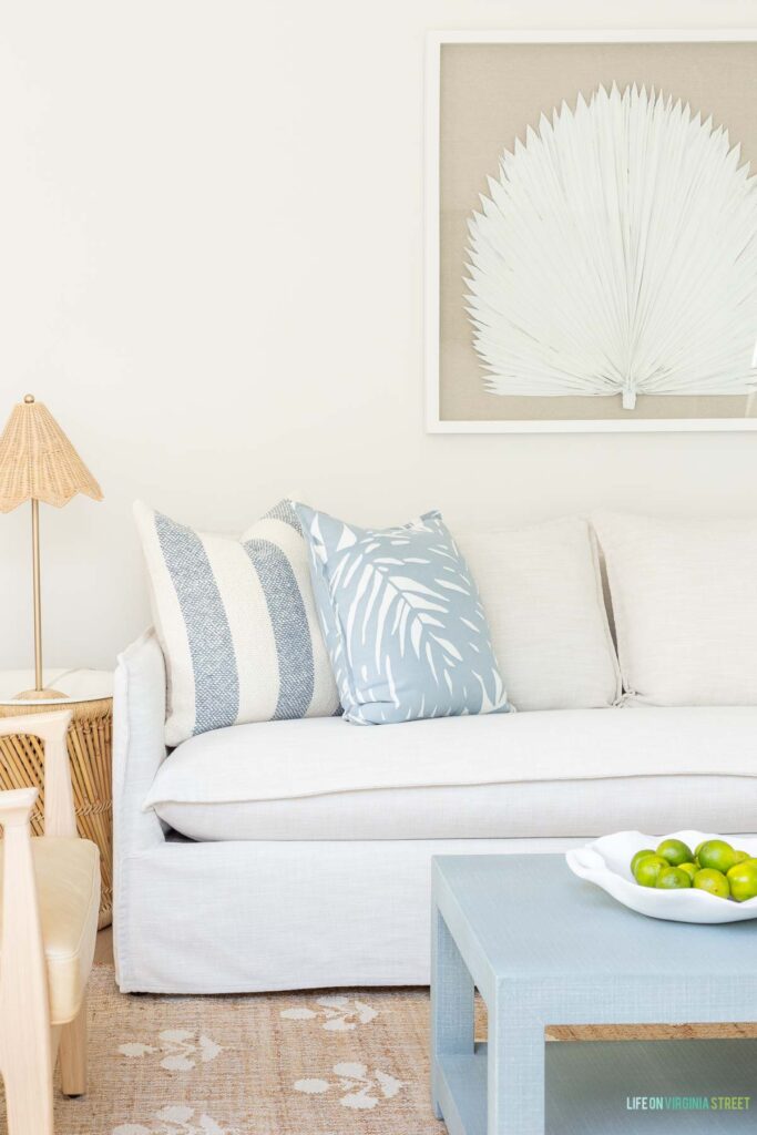 LIVING ROOM SOURCES: Sofas (read my full review here) | Chairs | Coffee Table | Indoor/Outdoor Striped Rug | Linen Pillows (color: Mineral Blue) | Patterned Pillows | Oversized Baskets | Frame TV | Vase | Similar Grapewood Branch | “Surf Tribe” Coffee Table Book | “Joie” Coffee Table Book | “Summer to Summer” Coffee Table Book | Ceramic Urchin Catchall | Woven Shades (color: Bonaire Flaxen) | Wall & Trim Paint Color: Sherwin Williams Snowbound