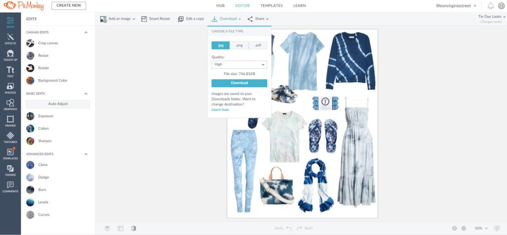 Once you have your design finished and looking the way you like it, simply click on the ‘Download’ menu item. You can select if you want a .jpg, .png, or .pdf file as well as the quality of your graphic. I typically save mine as a .jpg on High quality, but it’s really a matter of personal preference and what works best for your usage.
