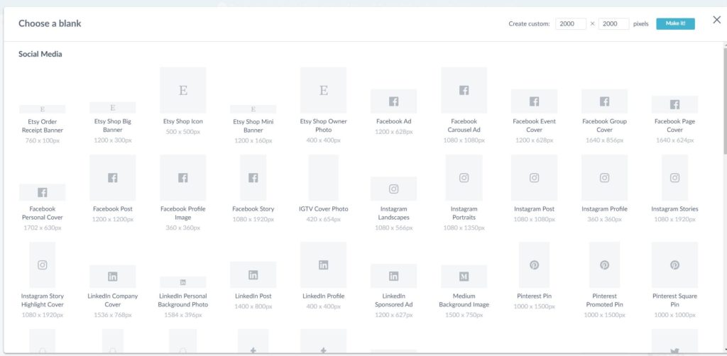 They have several size options and recommendations already created for you based upon your needs. So, for example, if you’re wanting a Facebook Post collage you could pick their pre-determined, optimal size for it. However, I always create a custom size. I usually create a custom size of 1600 x 2000 because it works well on multiple platforms for me, including my blog (and is in the 4×5 preferred ratio for Instagram). Once you pick which option you want, you click on ‘Make it!’.