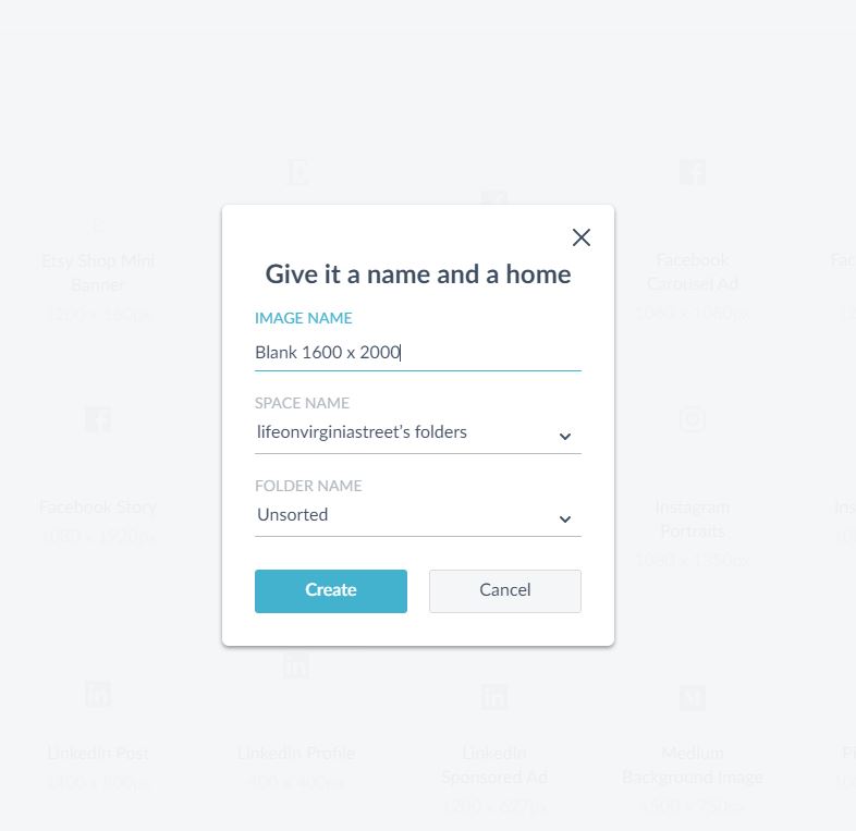 You can then give your image a custom name. This is completely optional. I leave the ‘Space Name’ and ‘Folder Name’ on the default, but know that you have the ability to create custom folders for projects if you start creating a lot of images! Click on ‘Create’ and you’re ready to go!