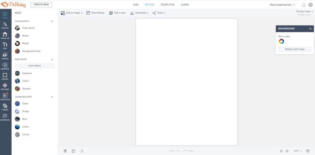 To start a new project in PicMonkey you can either start with one of their templates (they have really great options) or start with a blank canvas. For today’s purpose you’ll want to go the blank canvas route.