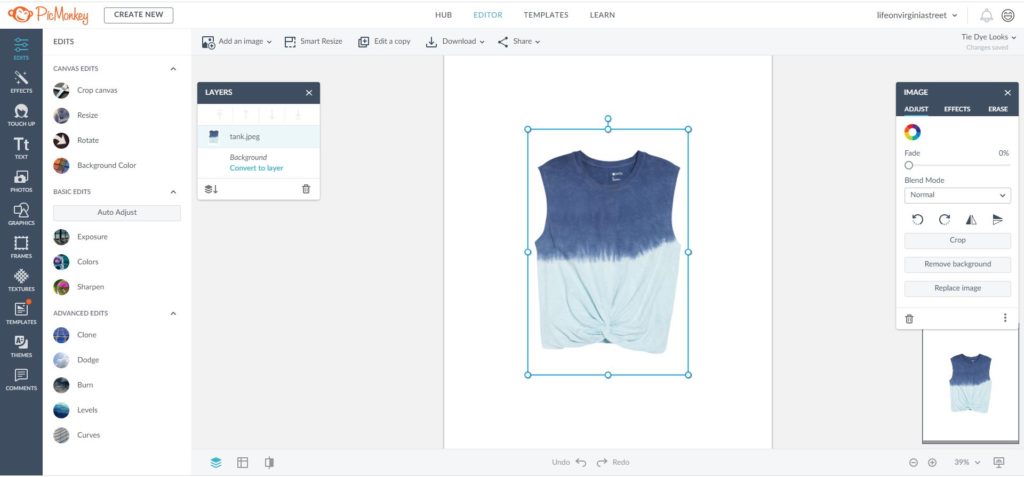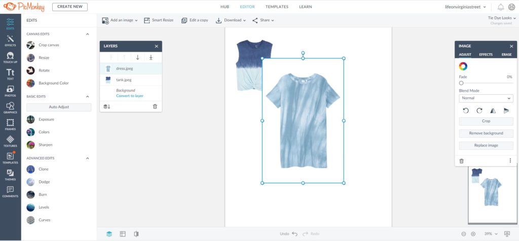 Then click on the “Remove Background” button on the right-hand side. In 99% of cases it will erase your background for you perfectly within a few seconds! I used to have to do this in a fairly manual process on Photoshop and it was rather tedious. I also had issues with products that were mostly white (it would over-erase). But PicMonkey Pro makes it so easy and saves so much time! Each collage now takes me about half the time it did in the past. It’s literally just the click of a button!