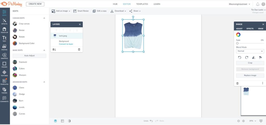 If you find that it wasn’t erased perfectly, sometimes you may need to go to the ‘Image’ menu on the right side of the screen and click ‘Erase’. You can then manually erase parts of the background that may have been left behind. Fortunately, I rarely have to do that with this tool!