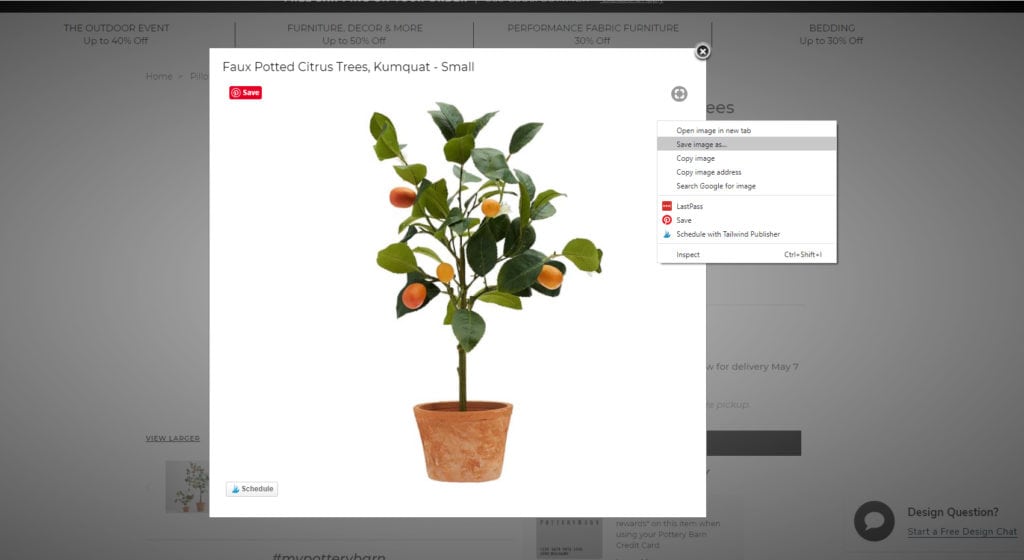 Here’s a sample of how I save from Pottery Barn after clicking the image I want to save. They usually have multiple styled versions of the product but usually they’ll have one with a clean background as well. On my PC I right-click the image and then select ‘Save Image As’ and then locate wherever I want to save the photo. Again, this will be different for every type of computer/device so you may have to Google how to save images for your specific device.