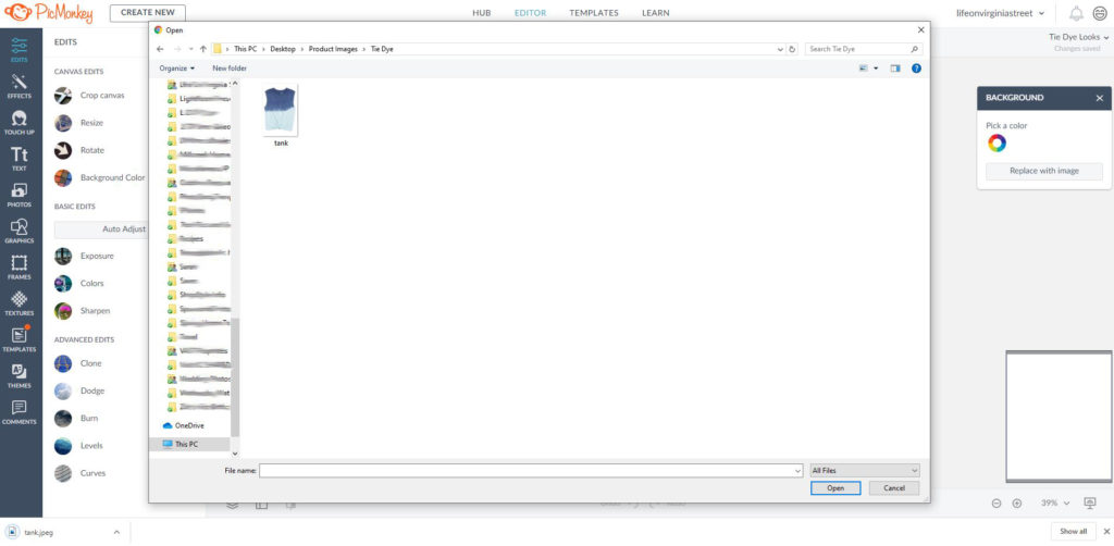 If you’re not on PicMonkey Pro or Canva Pro, you’ll want to use a background burner tool first before importing photos (like Background Burner) or opt to not remove backgrounds. You’ll use the tool to first erase the background (it may take some practice to get it precise) and then re-save to your computer again without the background. You will then be able to skip the rest of this step. You’ll just import your new images you want to use and then skip to Step 5.
