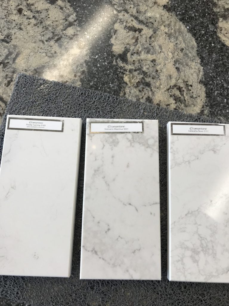 We narrowed it down to these three selections rather quickly: Frosty Carrina, Statuario Maximum, and Calacatta Nuvo.