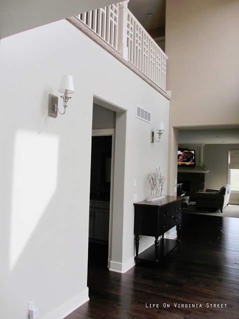 And here is the space now, complete with a fresh coat of paint – Behr Castle Path in Eggshell finish – along with new sconces {previously mentioned here}. The new front entry light also makes a big impact. I still need to style this space, but not sure if I should go with art/mirrors/etc. – any suggestions are more than welcome! In the first photo you can see the walls that still needed to be painted {straight ahead and to the right – the two-story walls}.