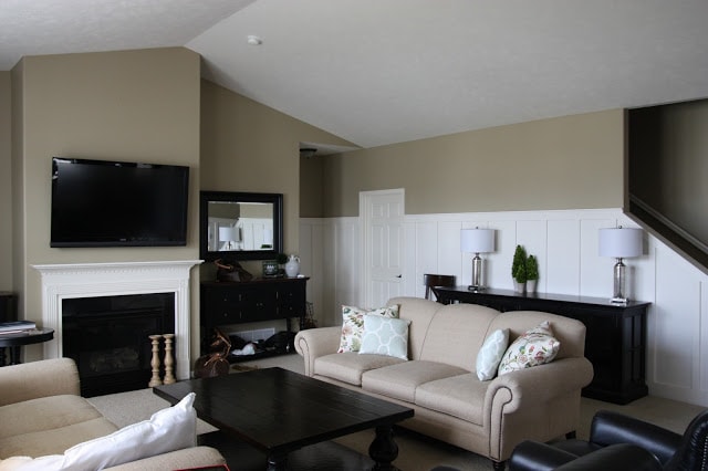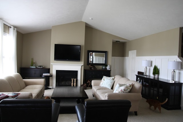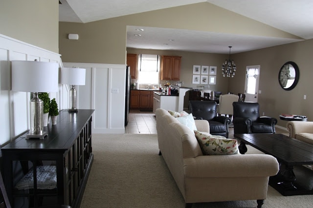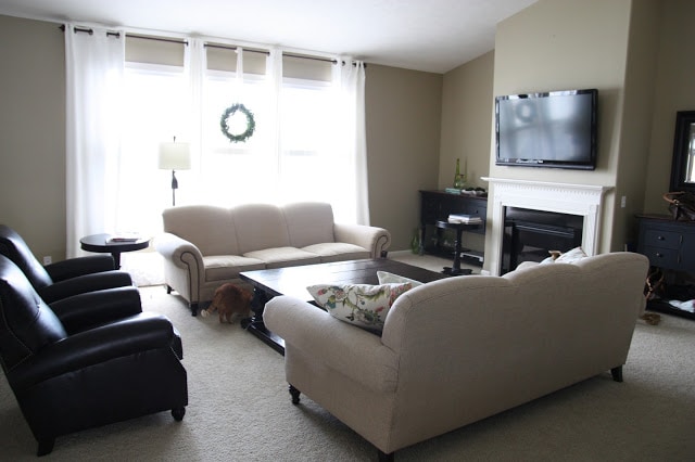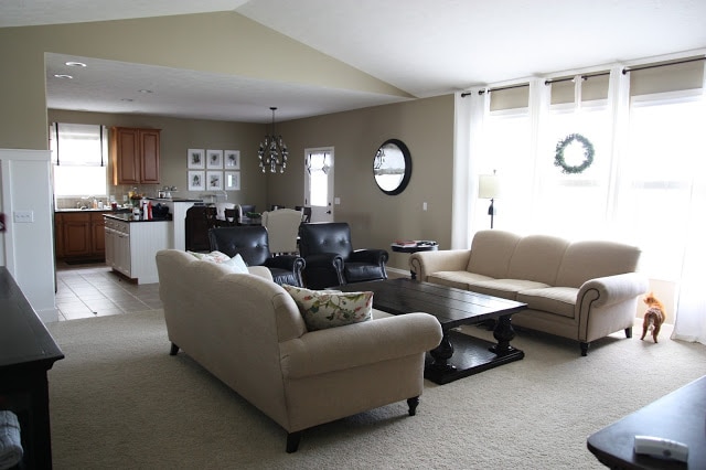 The rest of our living room furniture arrived yesterday {two chairs, a coffee table and a long credenza}. I feel like we are finally making progress in getting furniture that fills this space well. Now we just need some side tables and a few accessories. We have enlisted the help of Autumn Clemons to make an e-board with some recommendations. After our hour-long phone call yesterday I am really excited to see what she comes up with so we can finish this room once and for all! Here is the space as of this morning.
