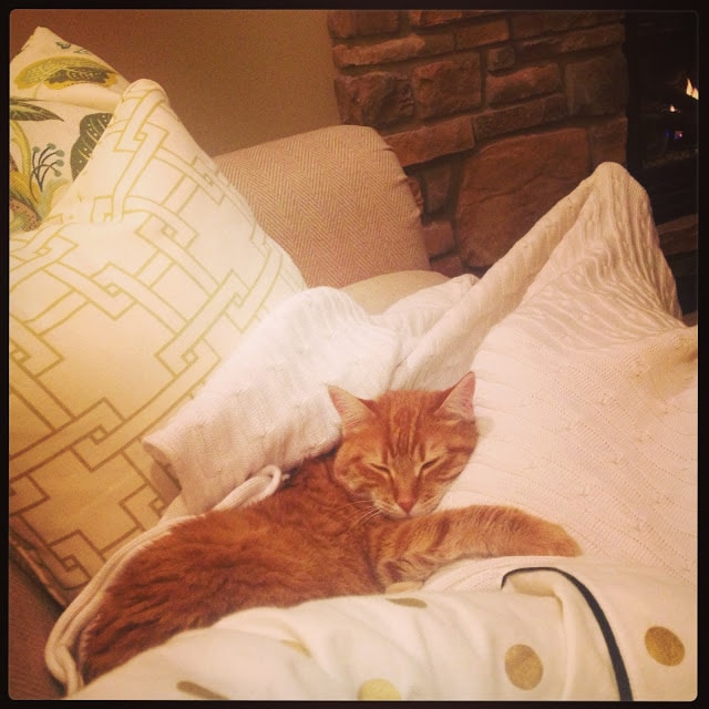 and doing some more cuddling in my new polka dot pajamas with the husband, cats + fire.
