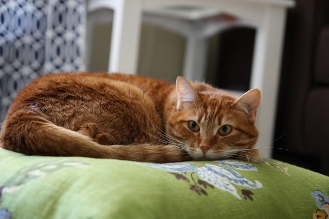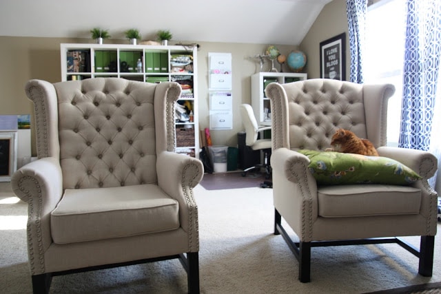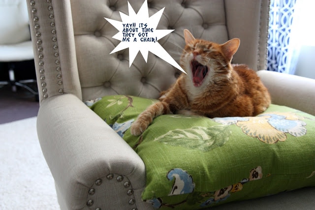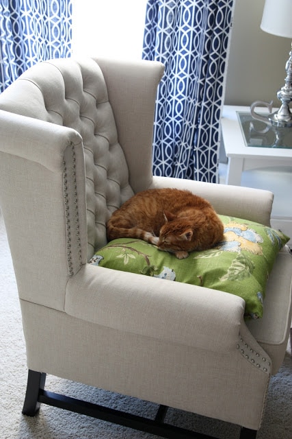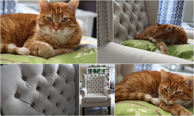 But, no worries for Sissy – she has a chair back! And if she looks upset, its only because she doesn’t want me taking her pictures while she is trying to fall asleep – not because she doesn’t love her new chair! I really love them as well – it is so nice to finally have some neutral linen chairs rather than the pattern we had before. I think these also look so much nicer than their Overstock price – even the husband likes them. A win-win for all!