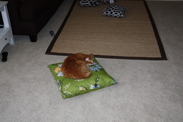 If you recall the bonus room looked like this for awhile but with my new color scheme also showing up {the blues and greens}, it was a hot mess for a long time. I then sold the chairs here and the room has been sitting rather empty. And our little Sissy has been pouting ever since. She really loved those chairs…notice she is sitting exactly where her chair used to be. I eventually moved this pillow over so she had a little padding.