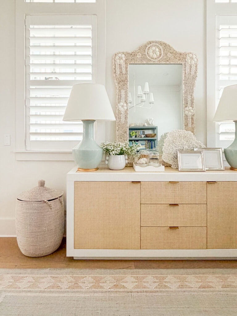 SOURCES: Shell Mirror | Rug | Hamper | Lamps | Raffia Sideboard | Standing Coral | Silver Frames | Wavy Tray | Faux Baby’s Breath | Bookcase in reflection