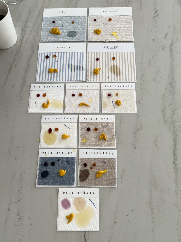 Speaking of samples, I did a really fun test for some fabrics we were considering on various pieces of furniture. I’ll be sharing all the results soon, but I tested red wine, coffee, Sharpie, yellow mustard (the literal worst) and olive oil. It was a really fun experiment! We have several of the fabrics below on pieces throughout our home currently but I added in several others I’m also considering that I haven’t had experience with.