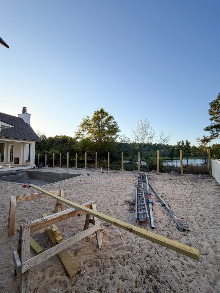 This next pic is on wide angle, so don’t get too excited by our “large” backyard 😉 It’s pretty tight in real life like most are in this area. The fence will only be 4′ high when it’s all finished (I’m guessing it’s sitting at about 6′ right now with the base about 2′ in the ground). We’ll be keeping it simple with a white rail on top (posts will also be painted) and then that black wire fencing you can see on the carriage house balcony above so it doesn’t block our view of the pond.