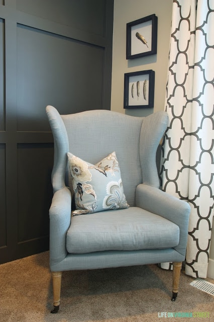 My office wingback chair I scored at HomeGoods is by-far my favorite. Linen-like material. Check. Feather down cushions for comfiness. Check. Rolled arms. Check. Nail head. Check. Some raw wood elements. Check. Wings. Double check.