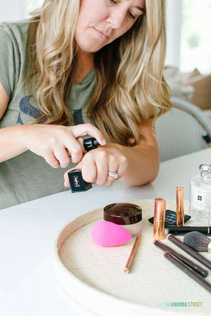 So often when I’m talking on Instagram Stories about home decor or sharing a photo of me with an outfit, I get more questions about my makeup than anything else. It always baffles me, but then I realize I do the exact same thing when I’m watching others. I’ll think, “What lip color is she wearing?! It’s so good!” Haha! So I totally get it. With that being said, today I’m sharing my five minute makeup routine along with some new and old favorites I use on a daily basis. Now that I’m officially 359 days away from turning 40 (not that anyone’s counting), I’ve made a few recent changes to my makeup routine. But, I also have some products I’ve used for nearly a decade and still swear by!