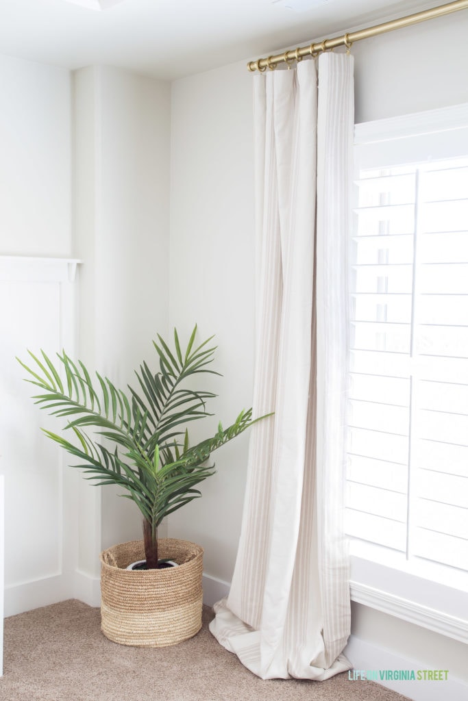 In an effort to ditch our prior unfinished drapes, I re-used these striped drapes that we already had. They are a bit long for our bedroom but I actually like the pooled effect. I opted to go with a full-length brushed brass curtain rod so that the drapes are now functional. I love how chunky the coordinating curtain rings are! Our curtain rod is the 120-170″ length, which is on major clearance right now in the brushed brass finish I chose.