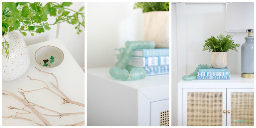 On the nightstands, I layered in different textures and earthy colors to stay in line with the overall theme. I recently started a seaglass collection and it’s fun to have additional memories from favorite beaches within reach!