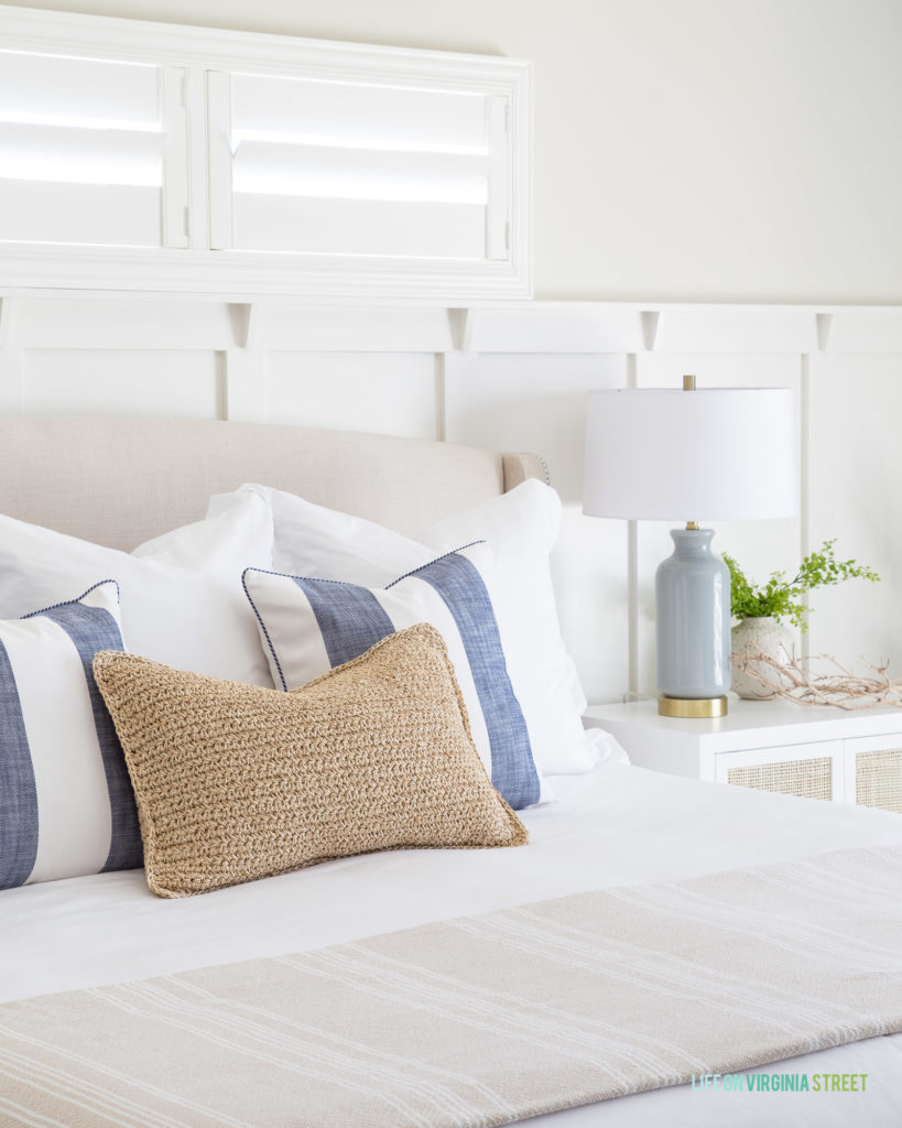 I layered the bedding with a natural woven pillow mixed with a striped version, both of which we’ve used in other rooms but I love them just as much here! The color palette is so serene and perfect for a bedroom! In the summer months, we remove the extra quilt at the end of our bed, and I usually add a lightweight blanket like this striped blanket if we need extra weight.