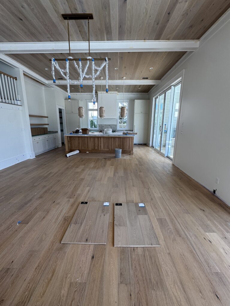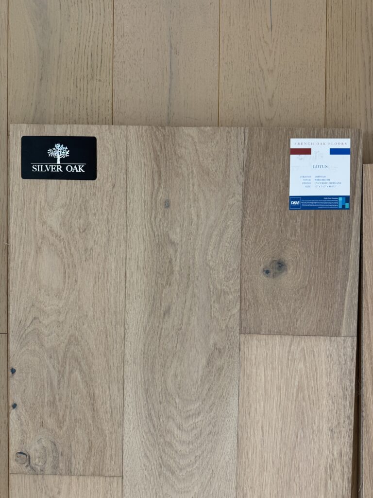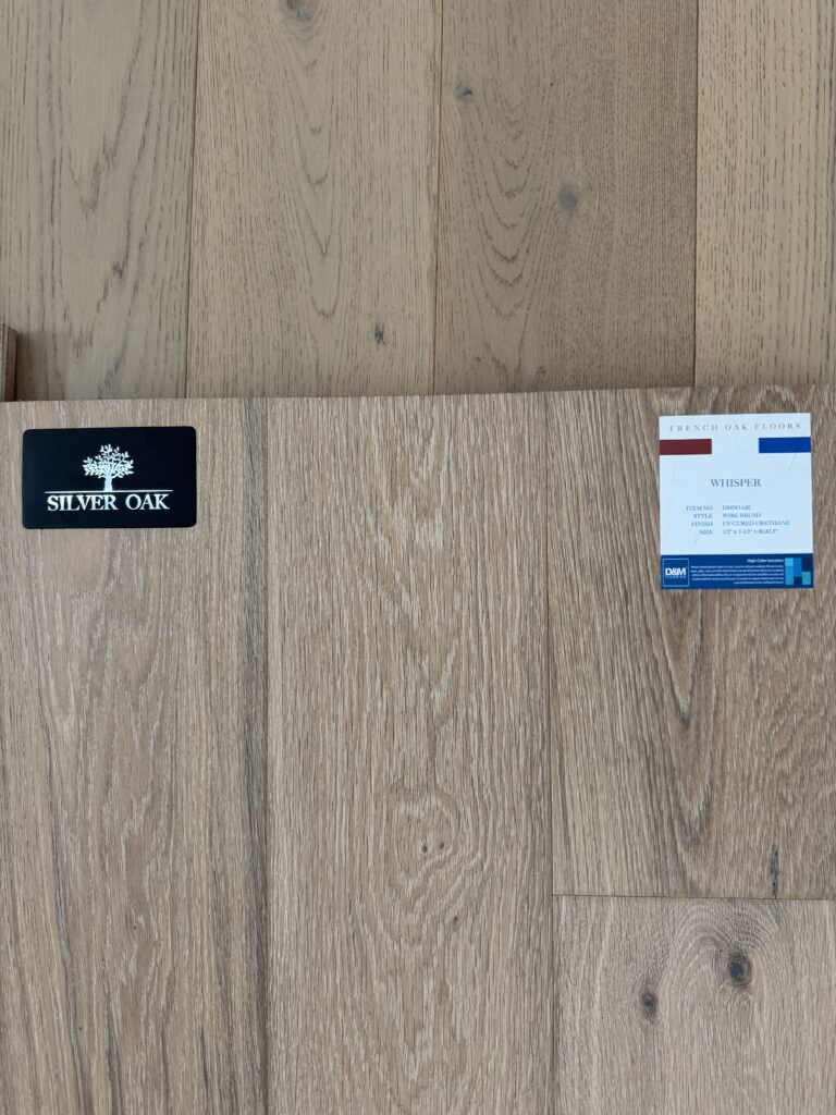 When it came to the hardwood floors specifically, I know pretty quickly what I like and what I don’t. So, when our rep at 8Five0 Tile suggested this white oak hardwood flooring (and showed a few stain samples), we committed pretty quickly when we heard it would be within budget. It’s the D&M Flooring Silver Oak French White Oak flooring. They said it’s one of their most popular floors and holds up well to our specific elements. So, it was a fairly easy decision. We went back and forth between the Whisper stain and the Lotus stain. We ultimately preferred the Lotus because it was slightly less red. It’s an 8″ white oak engineered hardwood, similar to what we have currently (the background in the next two pics) but in a slightly wider width. I like that you can see some of the grain and character.