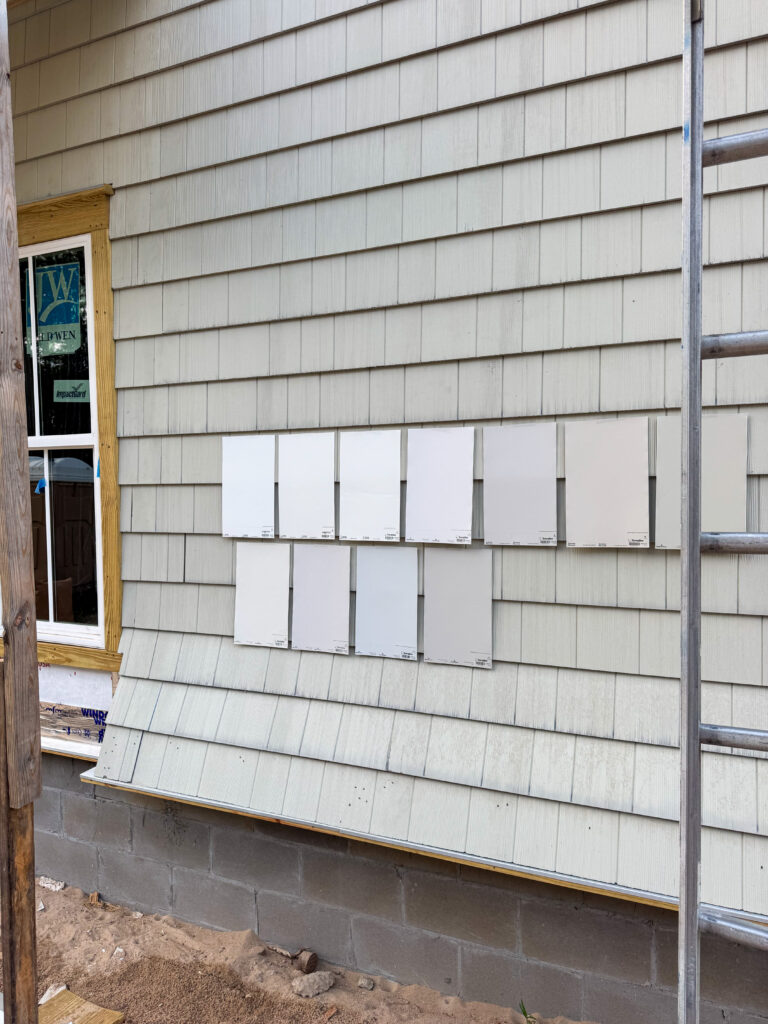Our builder put a large sample of each up with SW Pure White on the trim so we could see it in “real life”. We still really like both options, but ultimately decided on the BM French Canvas (the color on the right, below). I’m guessing they’ll be painting soon, as well! The shingle color we opted for is called Weathered Wood from GAF.