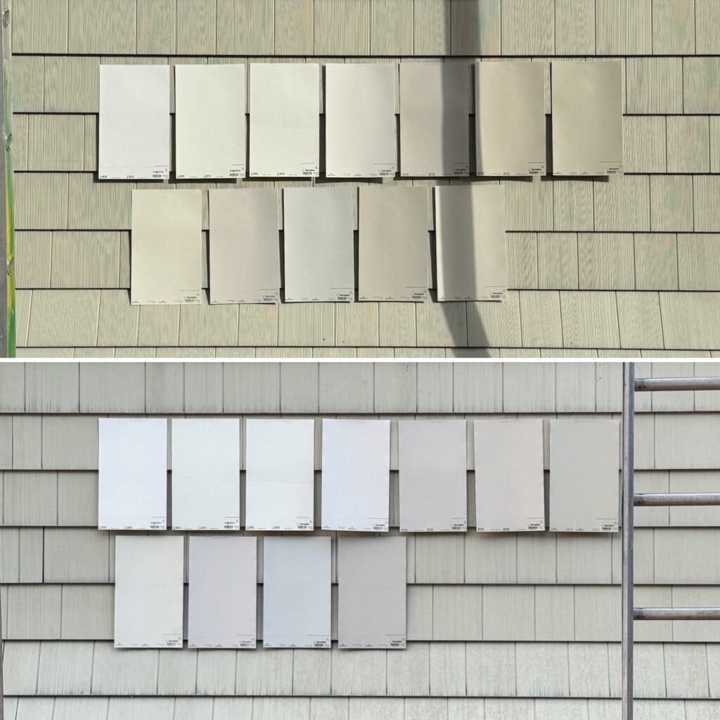 Our top two contenders were the one on the top right in the image below (BM Coastal Fog) and the bottom left (BM French Canvas).