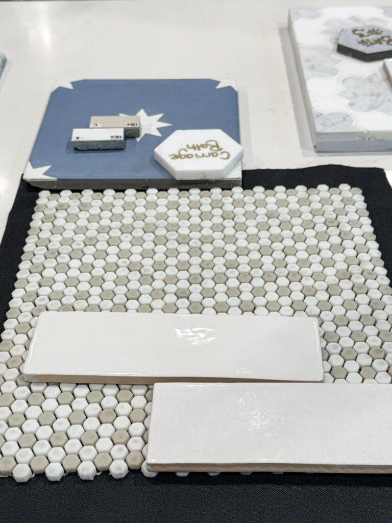 For the most part, I want to keep things very classic and timeless. But we have a few fun options thrown in, as well. The carriage house bath is one of those places. We’ll be doing the star tile on the floor (but in the tan and white colorway so it has less contrast), Cloe subway tile shower walls (I love the color variations from tile to tile), and this fun bubble mini hex tile on the shower floor. Kurtis and I kept rubbing our hands over it because it has such a cool texture!