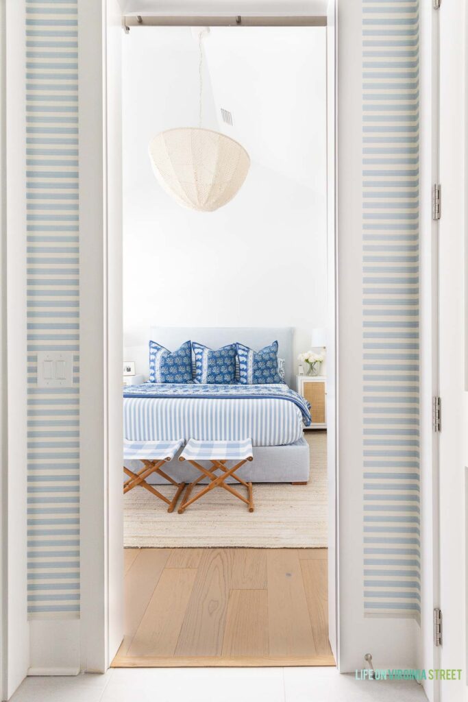 This next picture is older from last summer, but it’s one of my favorite views into the space! The blue and white striped wallpaper in our bathroom is just so fun!