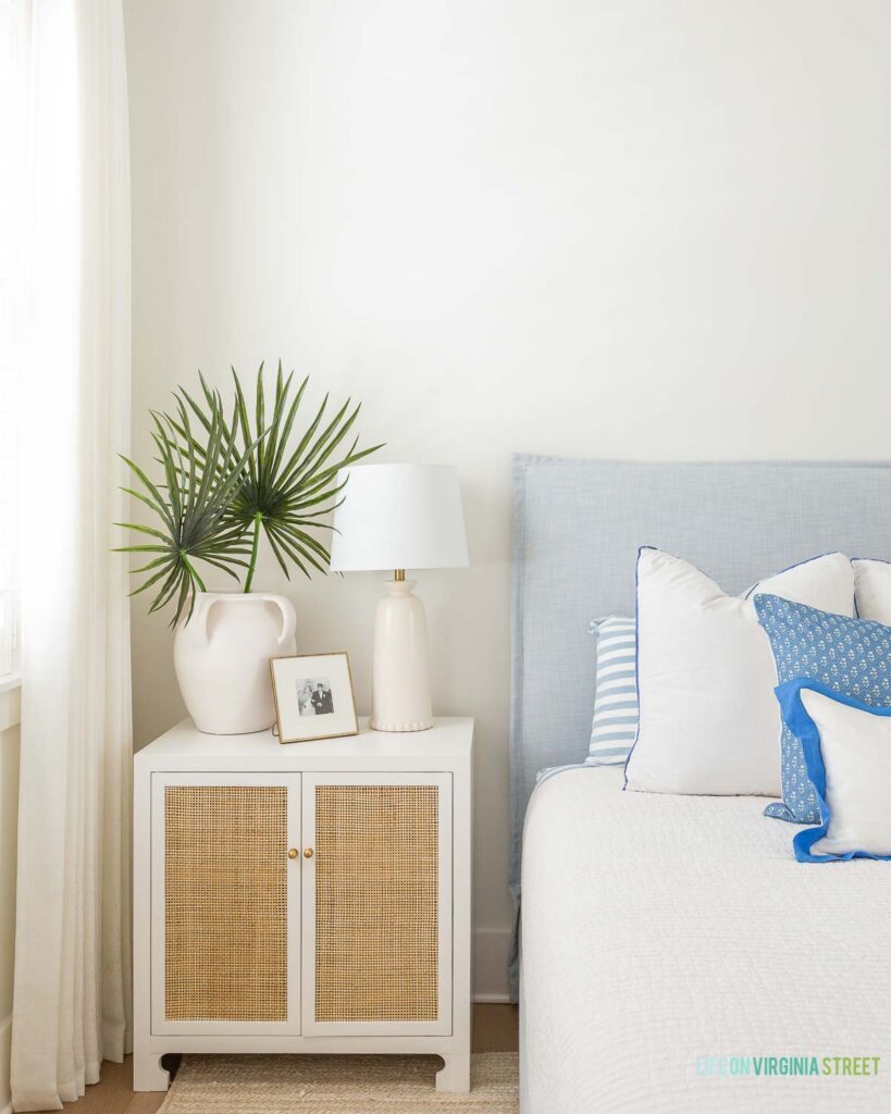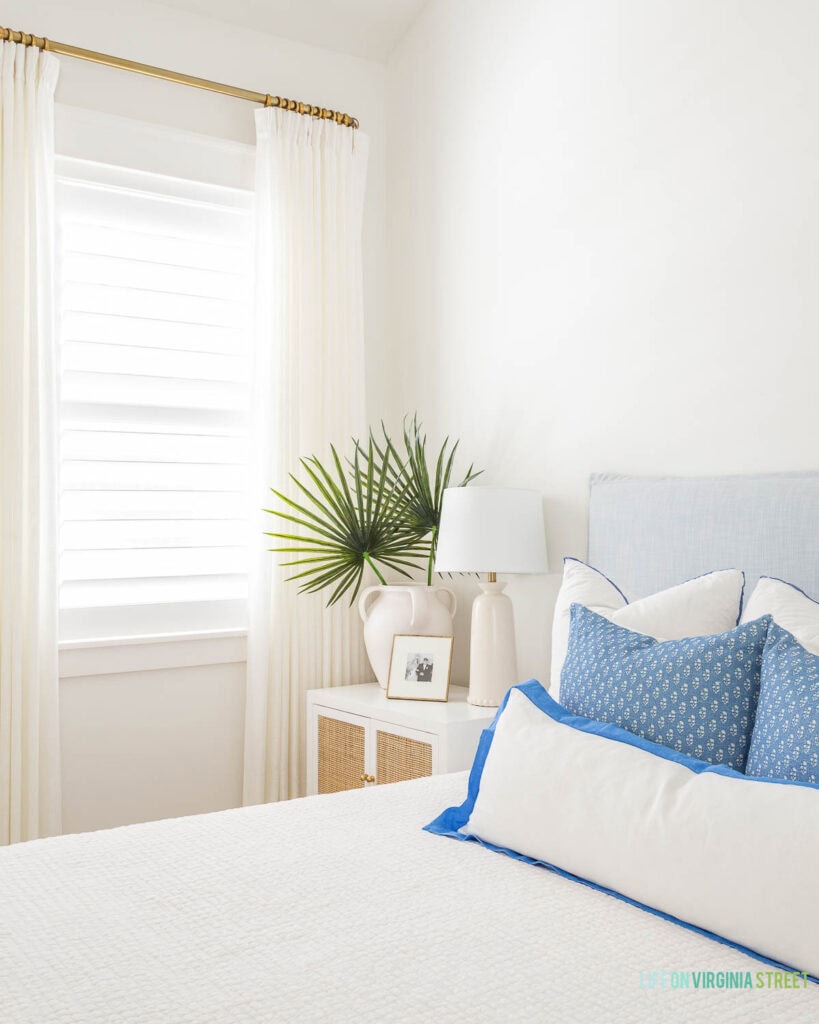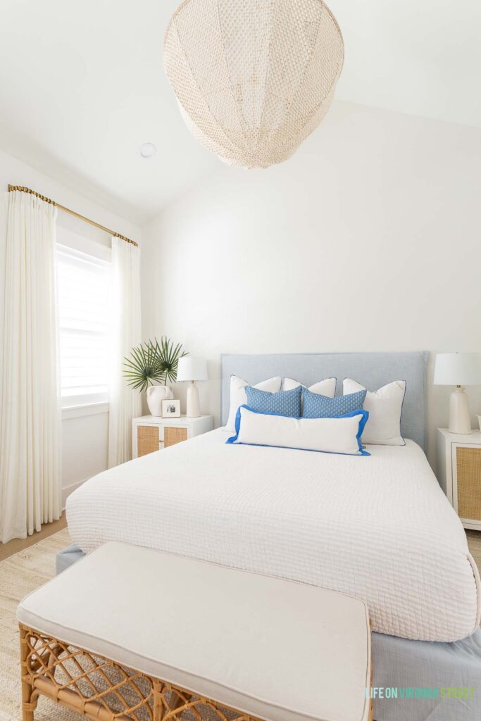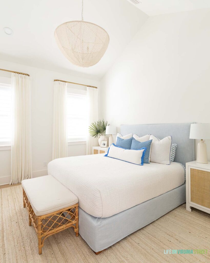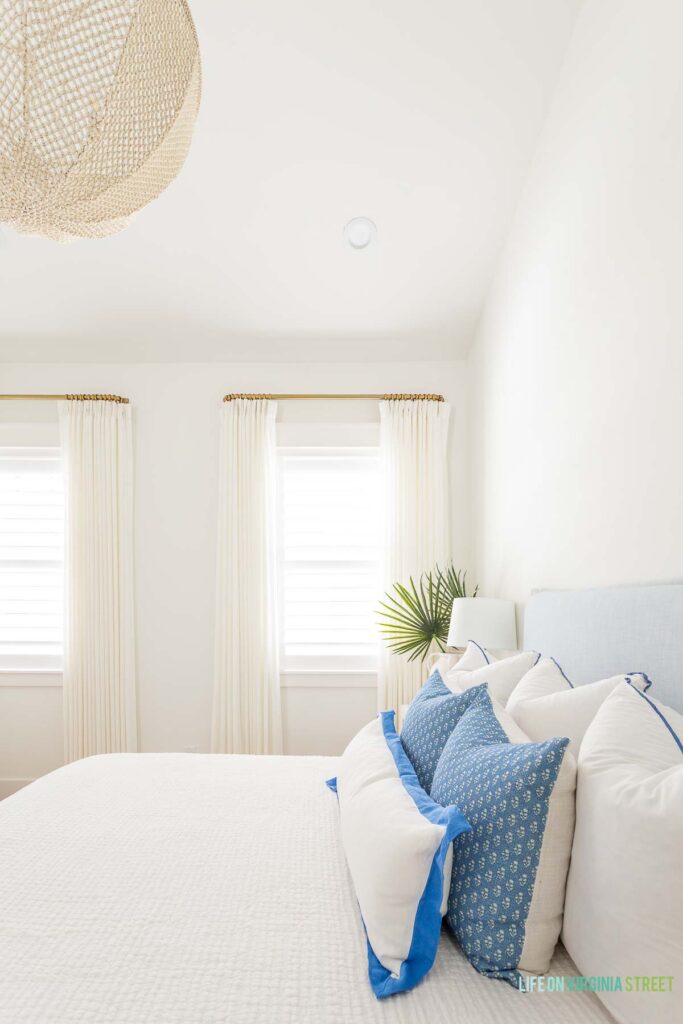 BEDROOM SOURCES: Pinch Pleat Curtains (Beige White) | Curtain Rods (1.25″ diameter) – look for less here | Curtain Rings | Blue Linen Bed (look for less here) | Nightstands (look for less here) | Striped Sheets | Pick-Stitch Quilt | Euro Shams | Block Print Pillow Covers | Long Linen Lumbar Pillow | Lamps | Vase | Faux Snowball Viburnum | Rug | Bench | Coral Style Mirror | Artwork | Wall and Trim Color: Sherwin Williams Snowbound