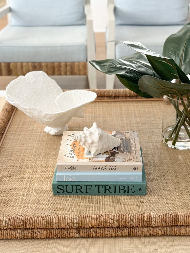 COFFEE TABLE SOURCES: Chairs | Coffee Table | Indoor/Outdoor Striped Rug | Oversized Raffia Tray | “Surf Tribe” | “Joie” | “Beach Life” | Faux Coral (Faux Leaf Coral option) | Faux Banana Palm Arrangement
