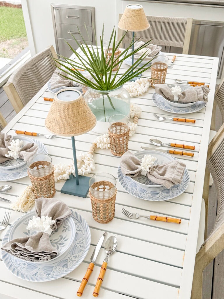 COASTAL TABLESCAPE SOURCES: Chambray Tile Melamine Dinner Plates | Chambray Tile Melamine Bowls | Cane Wrapped Glasses | Linen Napkins | Coral Napkin Holders | Bamboo Style Flatware | Rechargeable Table Lamps | Raffia Shades | Seashell Garland | Glass Colorblocked Vase | Dining Table | Dining Chairs