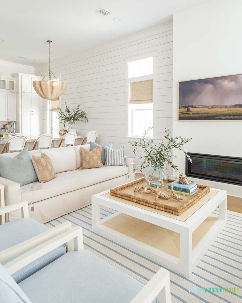 FALL LIVING ROOM SOURCES: Woven Shades (Bonaire Flaxen) | Sofas (read my full review here) | Chairs | Coffee Table | Indoor/Outdoor Striped Rug | Linen Pillows (Mineral Blue) | Paisley Pillow Covers | Small Stripe Pillow Covers | Wide Stripe Pillow Covers | Acrylic Drink Tables | Frame TV | Glass Vase | Faux Olive Branches | Similar Dried Grapewood Branch | Oversized Raffia Tray | “Surf Tribe” | “Surf Like A Girl” | Swivel Counter Stools | Woven Chandeliers (look for less options here)