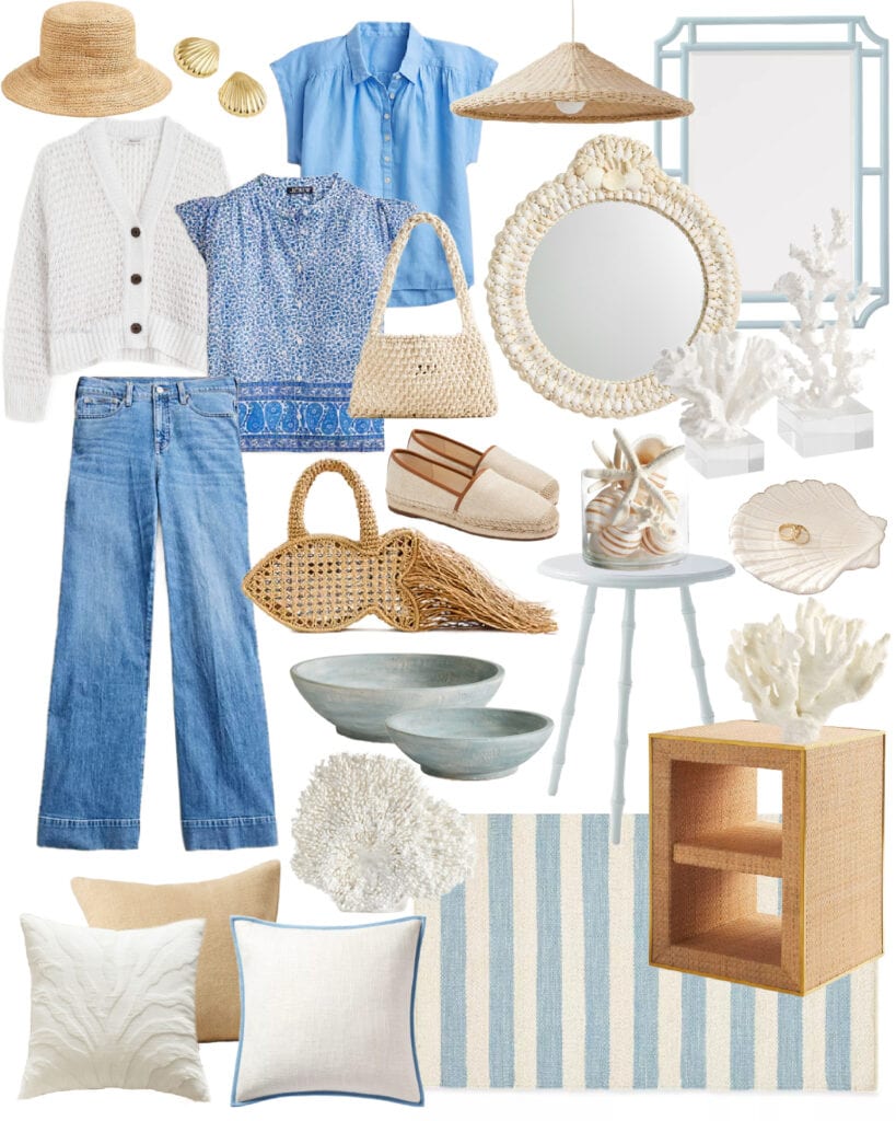 SOURCES: Wide Brim Raffia Bucket Hat | Open-Stitch V-Neck Cardigan | Metallic Shell Earrings | Flutter-Sleeve Block Print Top | Linen Shirt | High-Rise Denim Trouser Jeans | Hand-Knotted Raffia Fish Bag | Hand Knotted Shoulder Bag | Canvas Espadrille Flats | Bleached Rattan Pendant Light | Bent Rattan Mirror | Round Shell Mirror | Coral Bookends | Bamboo Style Side Table | Mixed Shell Vase Filler | Seashell Catchall | Coral Applique Pillow Cover | Everyday Linen Pillow Cover | Contrast Trim Pillow Cover | Chambray Artisan Handcrafted Bowls | Faux Coral Collection | Rattan Side Table | Striped Jute & Wool Rug