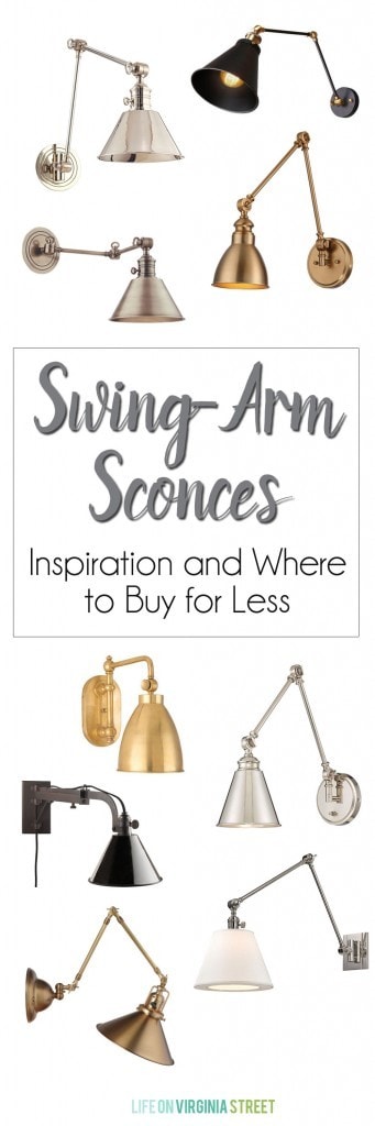 Following are a variety of swing arm sconces at a variety of price points. However, I tried to keep them all as affordable as possible! Simply click any of the images below to learn more about each of the items. Please note most of these items come in multiple finishes if you click through!