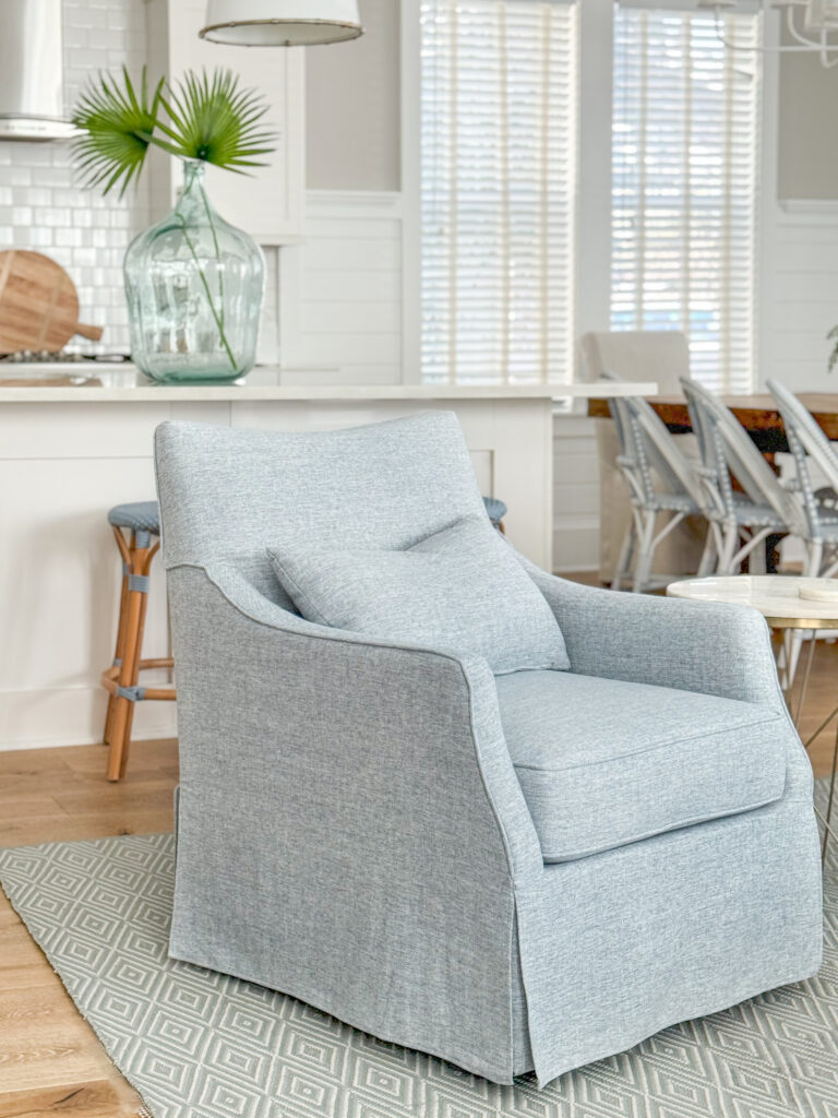 These light blue barrel chairs are another incredible find. The craziest part is, I bought ours for Casita second-hand from someone in our neighborhood. She had several kids but they looked almost perfect when I bought them from her. They’ve now been in Casita for nearly two years and still look every bit as good! I’ve found that by going with swivel chairs, guests are less likely to pick up furniture and move it where they want (yes, it happens). The rug, storage cabinets, recycled glass vase, and oyster art are also from Wayfair. With this particular rug, I’d only recommend it if you have a vacuum where you can either turn off the brushes or use a hard surface attachement to avoid snagging the decorative white loops. Otherwise it’s another great option!