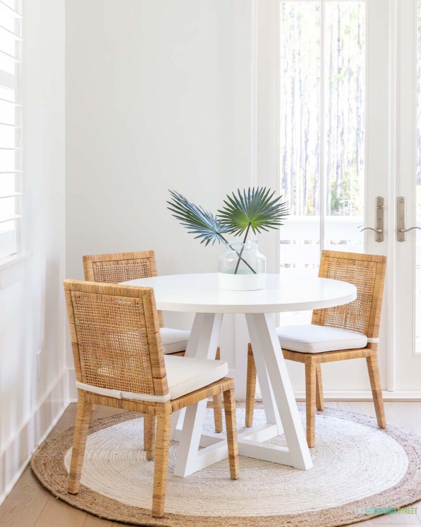 In the dining room at Casita, we went with these rattan side chairs and armchairs that we’ve loved for years and years. With rattan, you do run the risk in a rental (or really anywhere that’s high-traffic) that it can break. We did have one of the chair legs start to unravel just recently, but it was easy to glue back the rows that had come loose and it looked completely new again. But a major perk of these designer look-for-less chairs is that the seat covers are removable and washable!