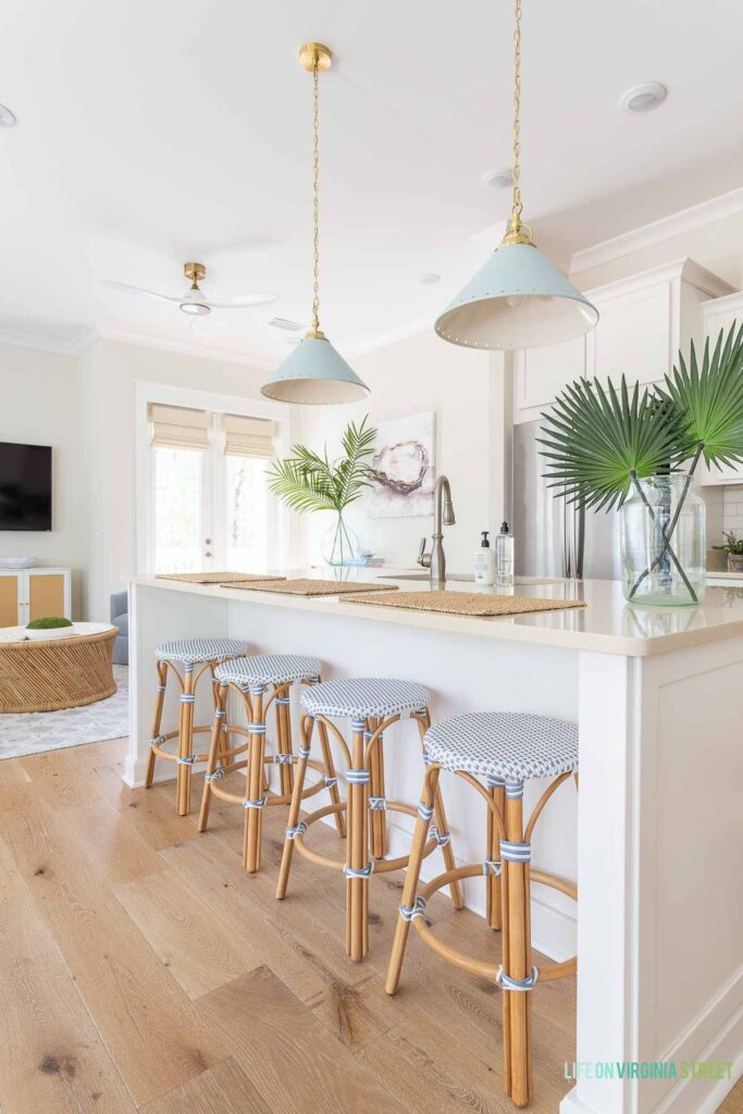 Peeking out in the photo above is another favorite – these woven counter stools! We loved them so much when we bought them at Hola Beaches four and a half years ago, we used them again at Casita almost two years ago. They’ve held up remarkably well and are so easy to clean. We actually had another set when we first moved to Florida that we used personally and our tenants bought them from us when we moved out and they moved in! I love all of the fun colors and patterns they offer (like stripes!) and they come in both counter and bar heights.