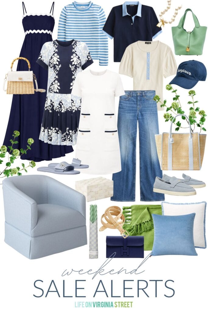 SOURCES: Ric Rac Maxi Dress | Bamboo Wicker Crossbody Purse | Floral Pleated Dress | Shift Dress | Striped Mockneck Sweater | Puff-Sleeved Ribbed Henley | Layered Polo Shirt | Denim Trouser Jeans | Baroque Pearl Necklace with Key Pendant | Hermes Picotin Lock 22 Bag | “Bonjour” Baseball Hat | Waterproof Caning Tote | Ballet Sport Loafers | Slide Sandals | Hermes Clutch | Snowball Viburnum Branch | Swivel Barrel Chair | Plaited Bone Boxes | McGee & Co. x Loeffler Randall Sybil Wax Taper Candles | Thin Leather Belt | Linen Throw Blanket | Cornflower Blue Velvet Pillow | Fringe Pillow Cover