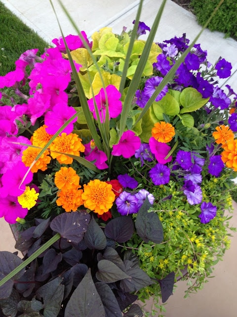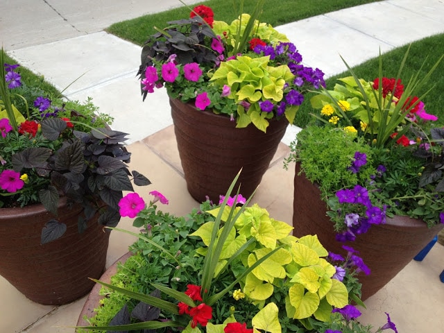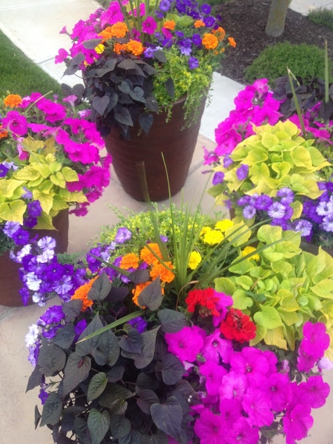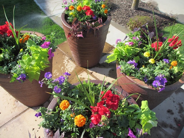 | {here they are last night, 6/7 – the petunias have gone CRAZY!} |