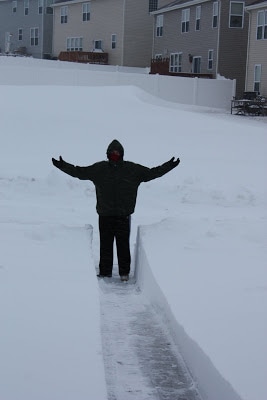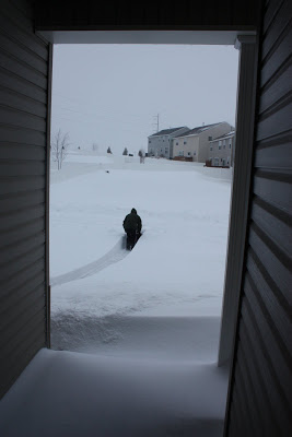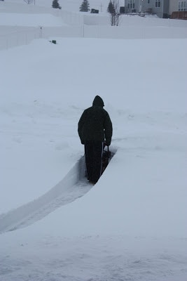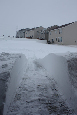 Typically, Nebraska does not get a ton of snow in a given winter (compared to what I am used to in Utah). You can always count on wind and freezing temperatures, but only two or three decent storms a year (with usually only a foot accumulation). This storm is not normal. We STILL have not left our house and it is STILL snowing. The husband is working on our driveway this morning because we would really like to go OUT to dinner tonight! Check this out. Keep in mind our snow blower is a pretty good size (not one of those tiny ones). In a lot of places the snow is several inches taller than the snow blower and at the end of the driveway it comes up to hubby’s hips! You can also see the snow is as high as our front porch, three steps off the ground and across the street it comes up to the neighbors 6 foot fence in some areas.