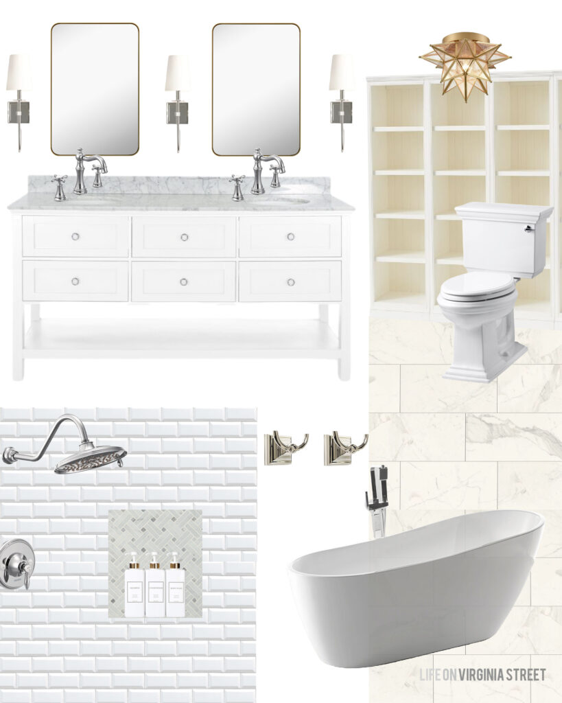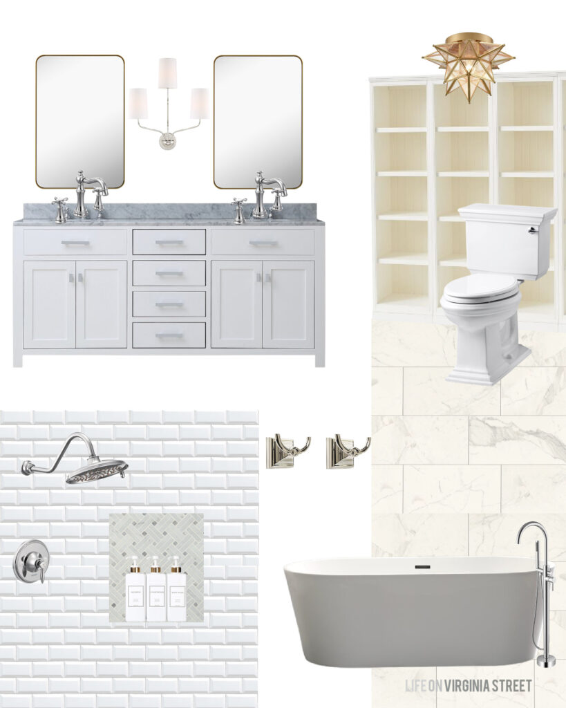 After ordering the tub this vanity over the 4th of July when it was on sale, I updated the board a little further. We also quickly realized we didn’t have room for so many sconces (and ultimately didn’t add any – we had to go with over mirror lights).