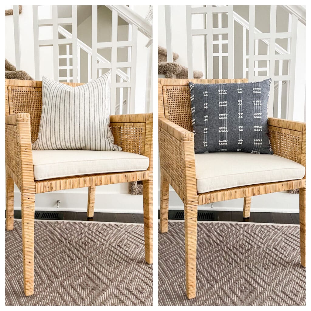 And here is the chair with each of the pillow options shown above! The striped feather filled pillow set is such an incredible value. If you don’t love the feather inserts included, they covers have zippers and you can swap them for your own inserts! Such a classic pattern that goes with so many others! And the tassel stripe pillow is definitely more of a denim color like my photo than the chambray name implies! Our rug can be found here (it’s the grey/ivory option, which is a warm neutral).