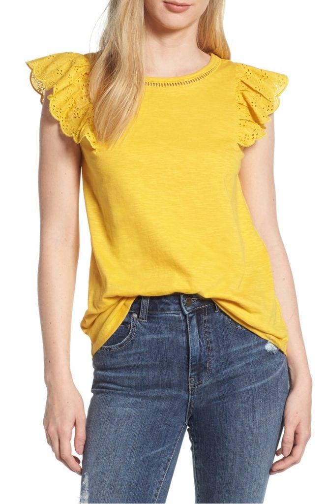 2 – I ordered this eyelet sleeve top last week and it is too cute for words! It comes in four colors but I decided to branch out a bit and get the yellow for summer. It’s seems to be the only season I can wear yellow (if I have a bit of a tan) and it is so cute on! The yellow has a slight mustard tinge to it that’s hard to see online and I love the slightly longer length. Such a fun summer top!