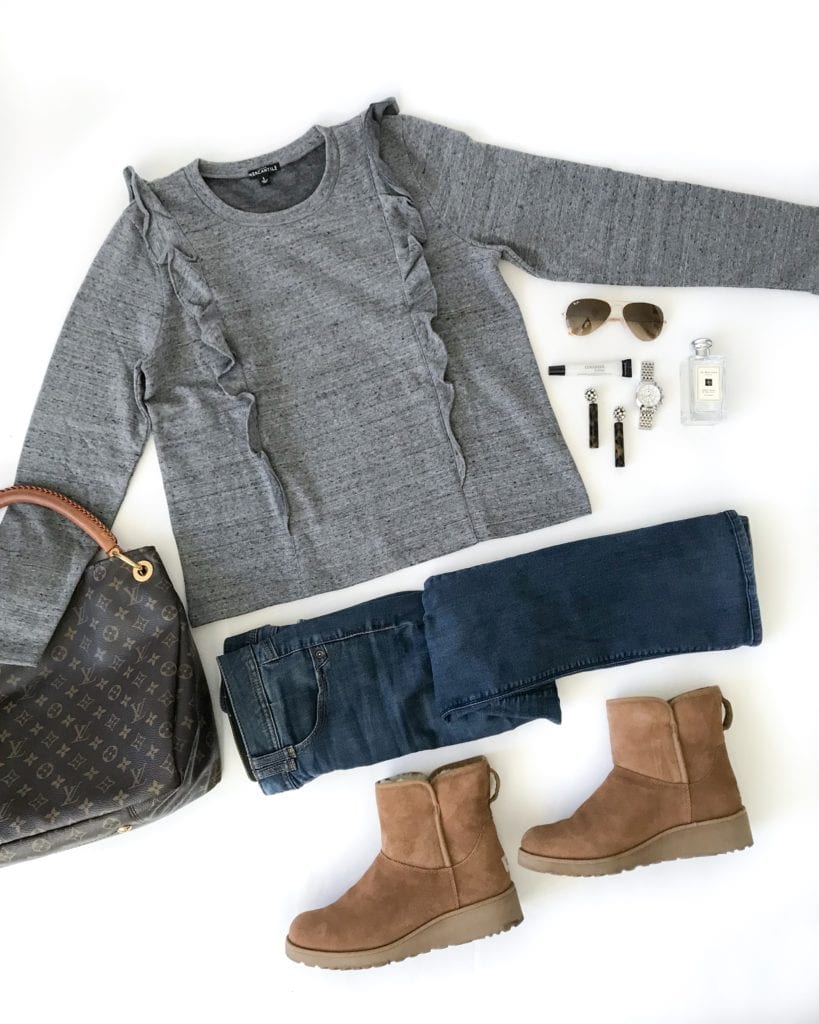 Solid Ruffle-Trimmed Pullover (Star Version here) | Cozy Boots | Louis Vuitton Handbag | Jeans (same cut different color) | Favorite Cologne | Crystal & Tortoise Earrings | Watch (same brand/similar style) | Coconut Frosting Lip Gloss | Aviator Sunglasses