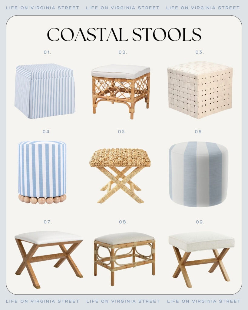 3 – One of my favorite functional accessories to decorate with is stools and ottomans! Not only do they bring life to a space, tucked under an ottoman or at the foot of a bed, but they also offer additional seating when needed. I also love them in front of a fireplace or to use as foot rests. So many great ways to incorporate them in your designs! Here are a few I’ve been loving lately.