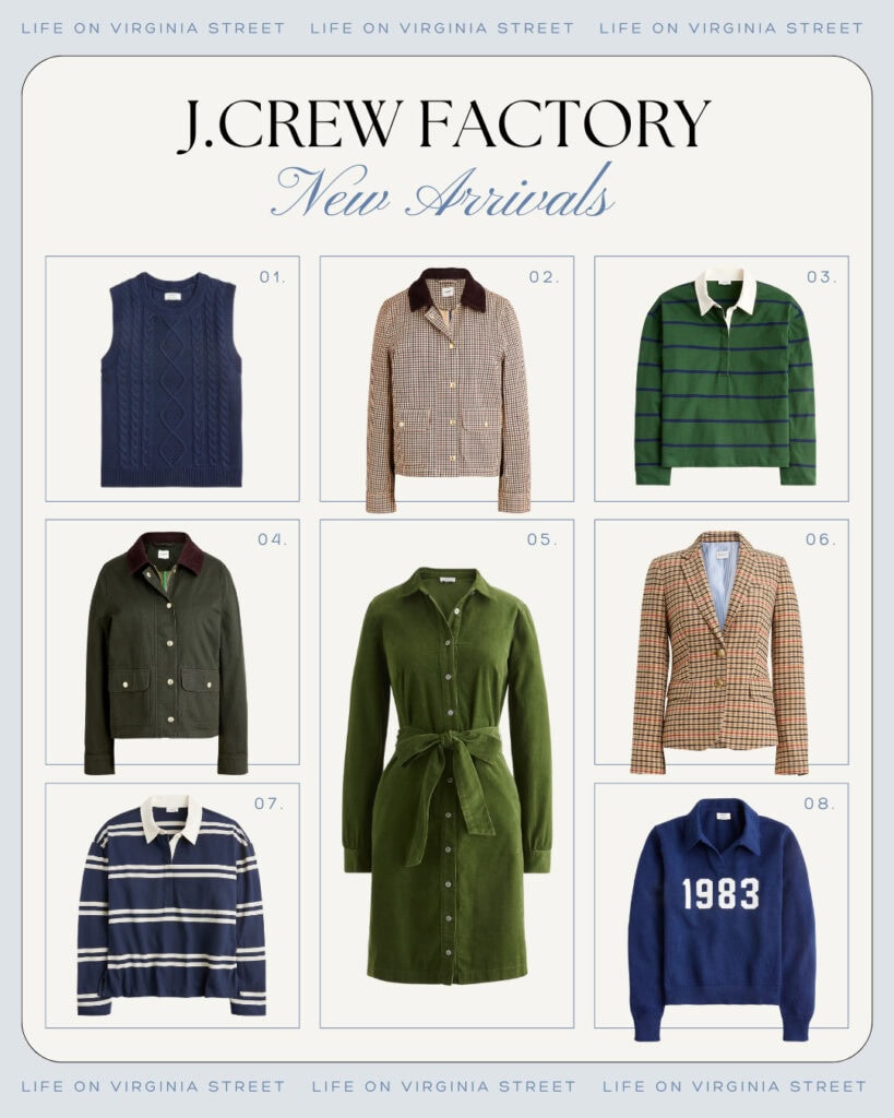 2 – Whenever fall rolls around, I love all the preppy vibes and dark colors that enter the fashion world! Despite being almost 45, I still love all the back-to-school look vibes! J. Crew Factory has so many cute new arrivals that embrace the trend. Here’s a few of my top picks! This jacket is one of my favorite purchases so far this season. All sources are listed below the graphic.