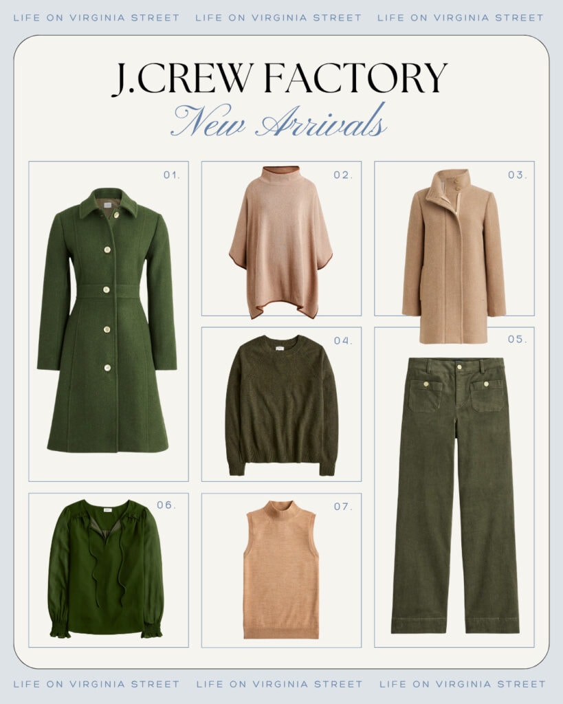2 – J. Crew Factory keeps bringing the new arrivals, and currently they’re offering 50% off sitewide (including an extra 50% off clearance with code STACK50). Plus, if you’re a cardmember, there’s still a few days left to save an additional 20% off your entire purchase with code CARDLOVE, so the savings really stack up! I always love a mossy, olive green tone in the fall! All sources are listed below the graphic.