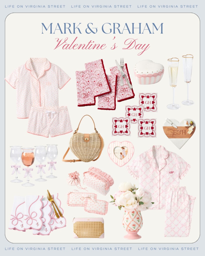 SOURCES: Ric Rac Block Print Pajamas | Valentine’s Napkins | Heart Ceramic Catchall Dish | Heart Coasters | Heart Champagne Glasses | Marble & Wood Heart Serving Board | Bow Wine Glasses | Wicker & Leather Heart Crossbody Purse | Heart Picture Frame | Scalloped Bow Napkins | Ruffle Cosmetics Pouch | Waterproof Caning Pouch | Ceramic Vase | Sateen Pajamas